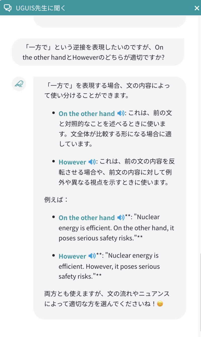 さらに、AIチャット機能「UGUIS先生」を使えば、わからない点をその場で質問できます。