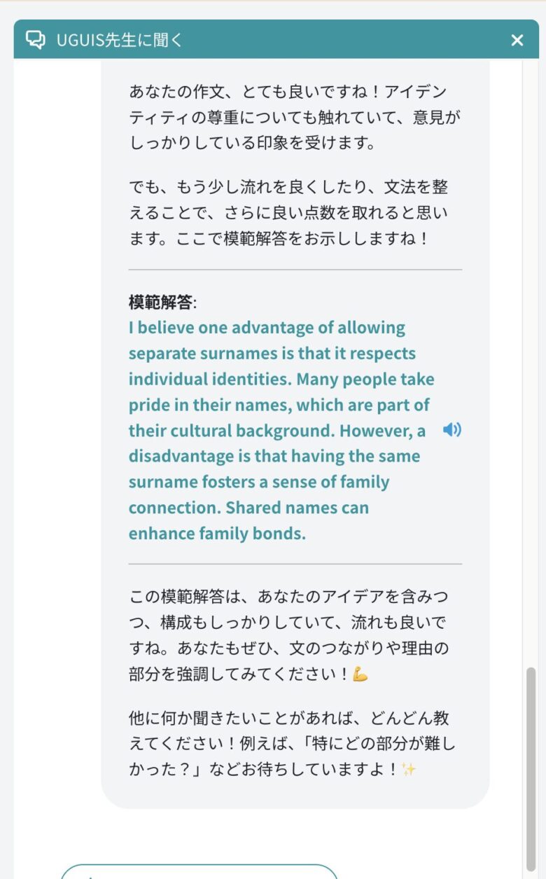 このように、UGUIS先生は「模範解答を教えて」「この表現で良いか」「より自然な言い回しはないか」「論理展開のアドバイスをください」など、様々な質問に柔軟に対応してくれます。