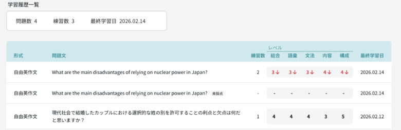 これまで解いた問題の履歴は全て残り、いつ何をしたか、点数はどうだったか、また、添削のフィードバックなど全てわかります。